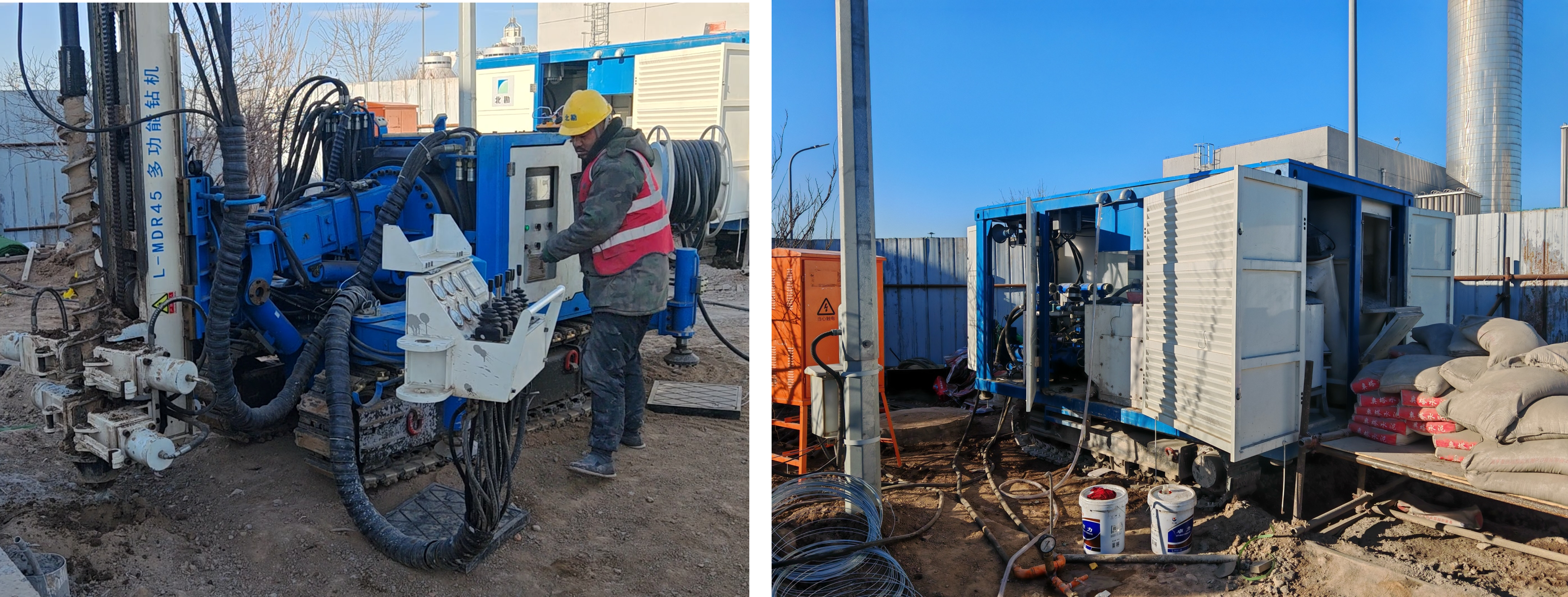 針對現(xiàn)有同類設備的不足,我院成功研制了適用于有限空間的小型化、智能化注漿成套設備。其中L-MDR45型低凈空全液壓履帶式多功能鉆機工作高度2550mm/3550mm,工作寬度1600mm,具備多種成孔方式,可實現(xiàn)多姿態(tài)調整與數(shù)字化監(jiān)控。L-SGS30型低凈空履帶式智能注漿站工作高度2500mm,工作寬度2000mm,集成自動制漿、儲漿、注漿功能,實現(xiàn)注漿壓力和流量的無級調整及精細化穩(wěn)壓控制;兩臺雙液注漿泵可實現(xiàn)單液漿4點或雙液漿2點同時注漿,可實現(xiàn)任意體積比雙液漿注漿,支持關鍵數(shù)據的存儲和導出。