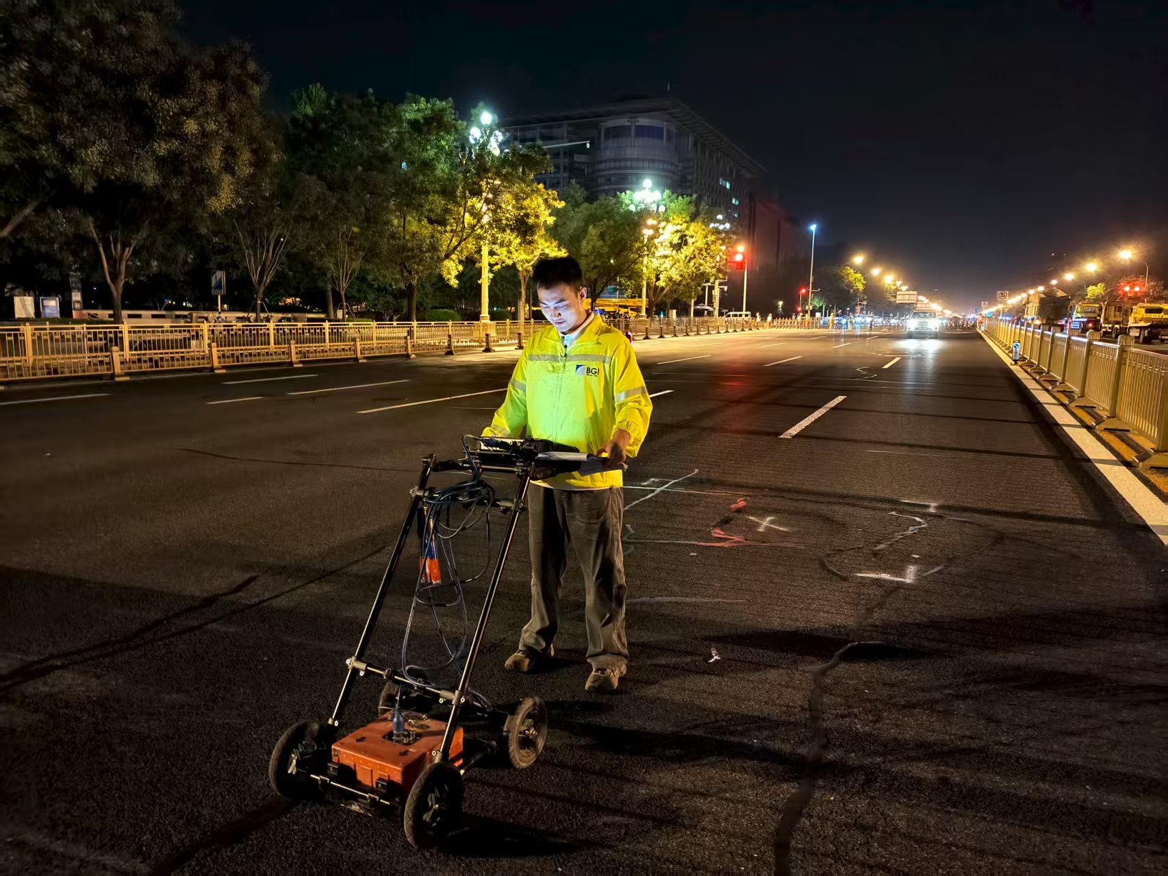 檢測一院工程師在海淀區(qū)某地進行地下病害探測