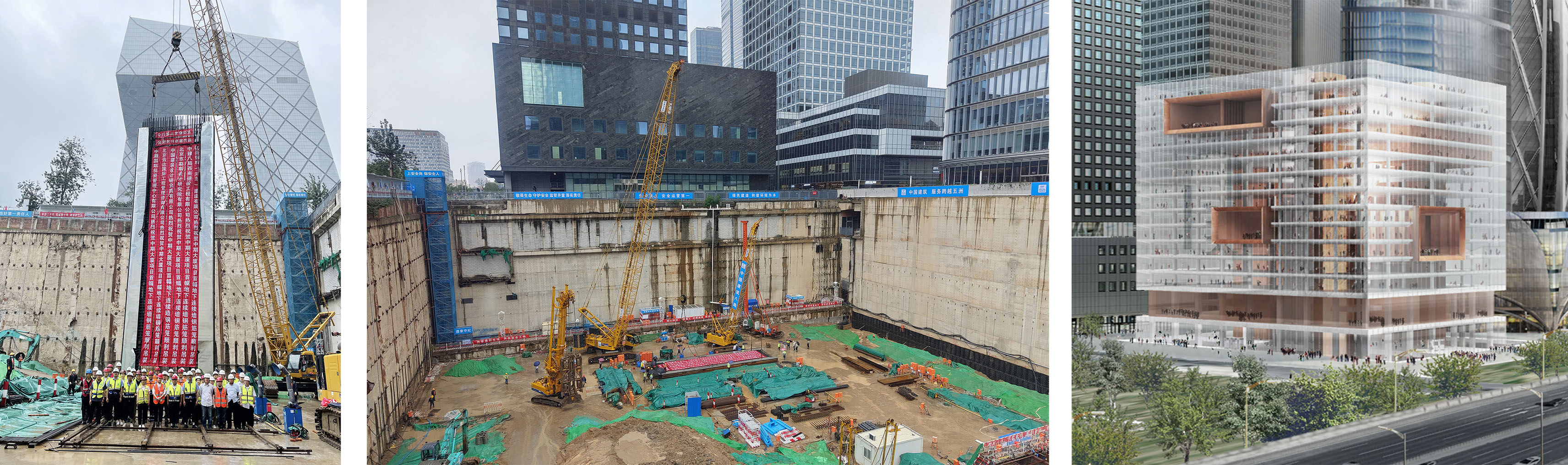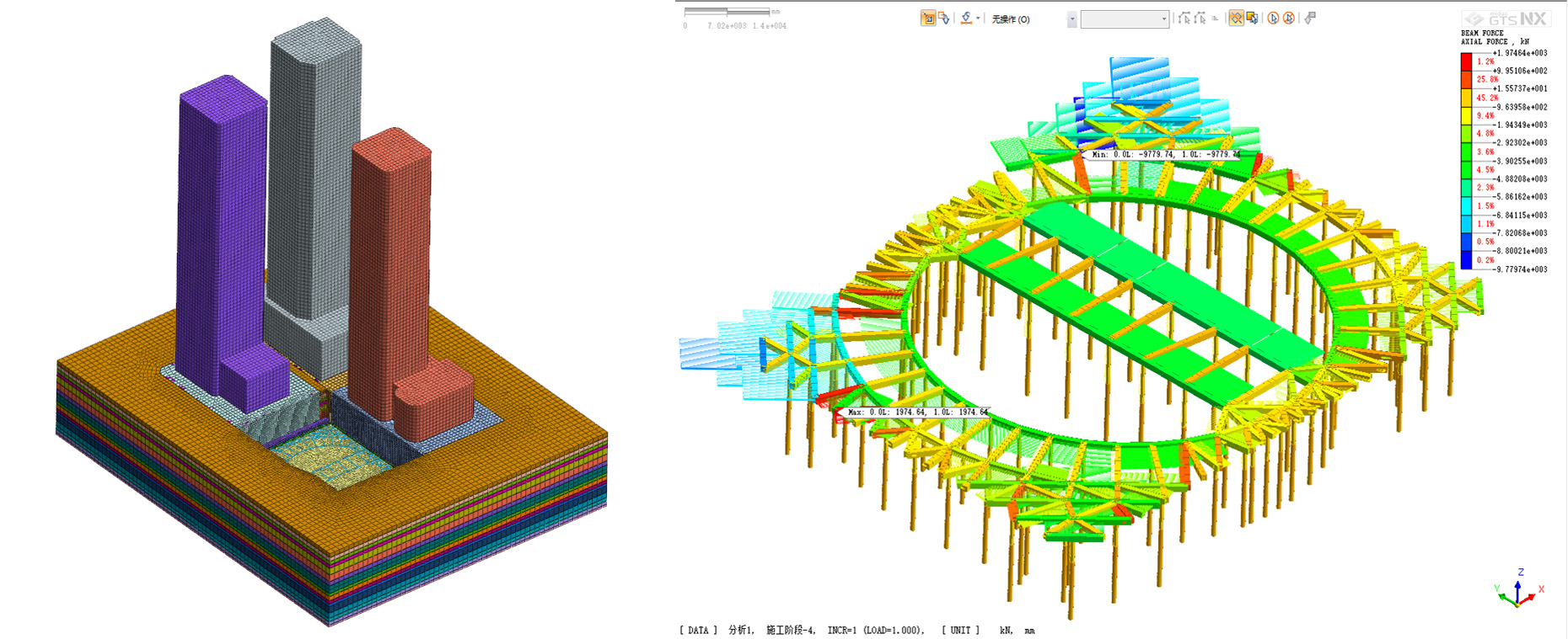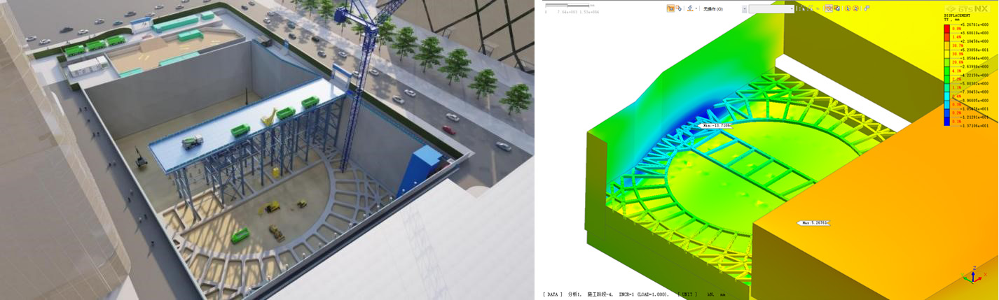 針對基坑超期服役情況,開展基坑安全性專項(xiàng)檢測與評估工作,通過支護(hù)結(jié)構(gòu)體系檢測、地下空洞探測、變形與沉降數(shù)據(jù)分析與反演、數(shù)值分析與安全性評估等多種手段,為超期服役基坑安全保駕護(hù)航;在基坑設(shè)計(jì)階段,項(xiàng)目團(tuán)隊(duì)采用三維數(shù)值分析技術(shù)對基坑開挖影響進(jìn)行輔助設(shè)計(jì),綜合考慮安全性、經(jīng)濟(jì)性、工期、施工便利等多個方面,歷經(jīng)多次重大評審后確定最終設(shè)計(jì)方案;創(chuàng)新性地采用“兩墻合一”做法,采用600mm厚地連墻兼做地下室結(jié)構(gòu)外墻,內(nèi)側(cè)設(shè)置內(nèi)襯墻形成復(fù)合墻,成功解決了超近接建筑物支護(hù)空間不足的難題。同時設(shè)計(jì)了異形導(dǎo)墻、墻外接頭后注漿、建筑防水層改進(jìn)、施工棧橋與盆式開挖、外側(cè)結(jié)構(gòu)預(yù)換撐等多種針對性措施,解決施工過程中的臨時支護(hù)和后期換撐問題,設(shè)計(jì)構(gòu)造節(jié)點(diǎn)施工便利、安全可靠;為解決墻體預(yù)留插筋和預(yù)留接駁器做法成功率不高的行業(yè)難題,創(chuàng)新性地提出并采用墻內(nèi)側(cè)預(yù)留鋼板做法,與總承包單位和結(jié)構(gòu)設(shè)計(jì)單位反復(fù)討論與研究,細(xì)化鋼板預(yù)埋件布置,為項(xiàng)目順利實(shí)施提供了最優(yōu)方案。