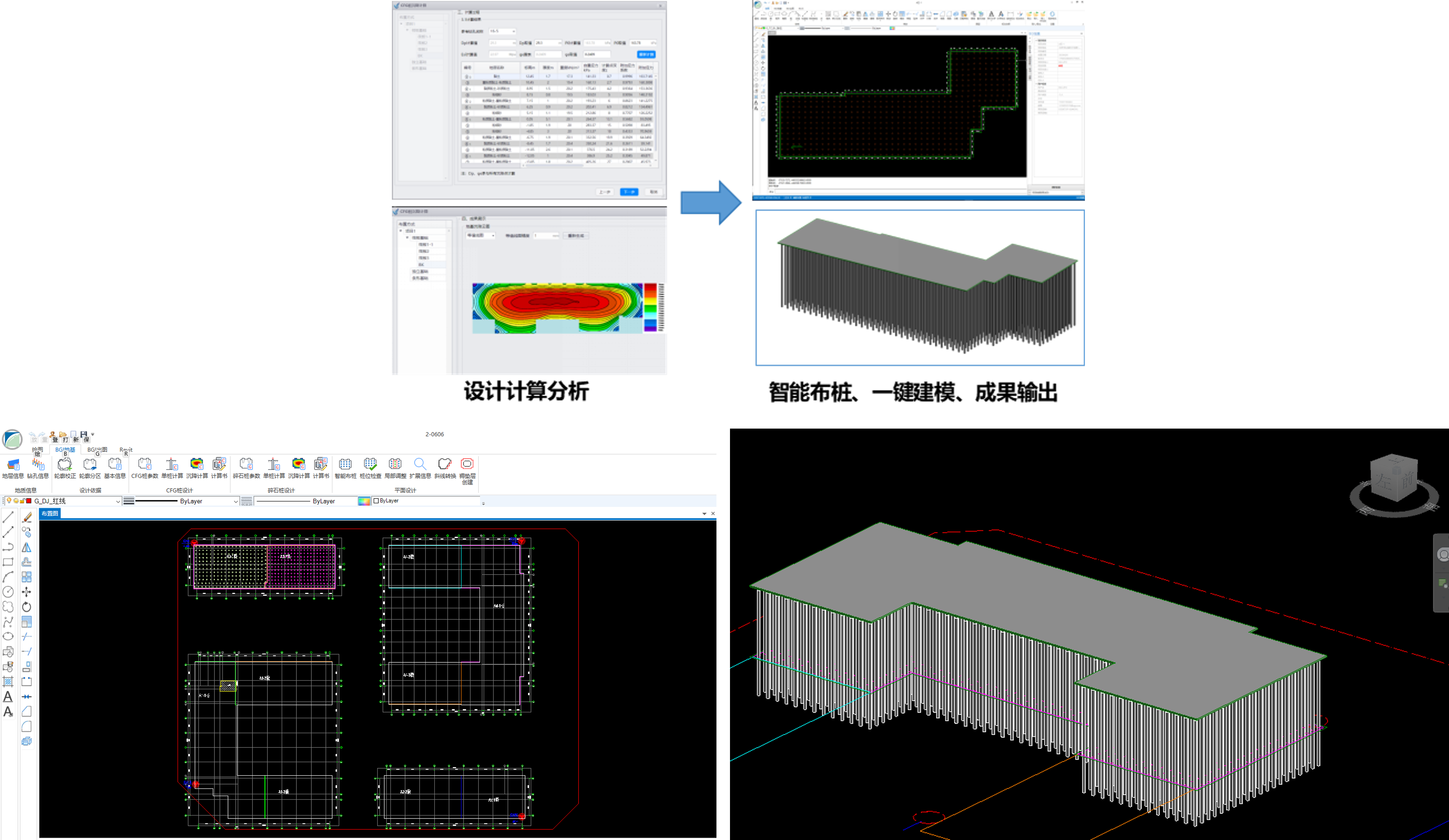 平臺集成計算書匯總自動輸出、布樁圖自動生成、樁位自動編號、一鍵智能標注、樁位智能調整、設計圖輔助設計、參數一鍵輸出、工程量成果自動統(tǒng)計等系統(tǒng)化的輔助輸出功能,對設計成果進行全方位、高效能的優(yōu)化與整合,顯著提高設計工作效率,確保設計成果的精準性和一致性,幫助工程師專注于設計的核心創(chuàng)意,為項目質量審核、過程管理、成果交付工作帶來極大便捷。